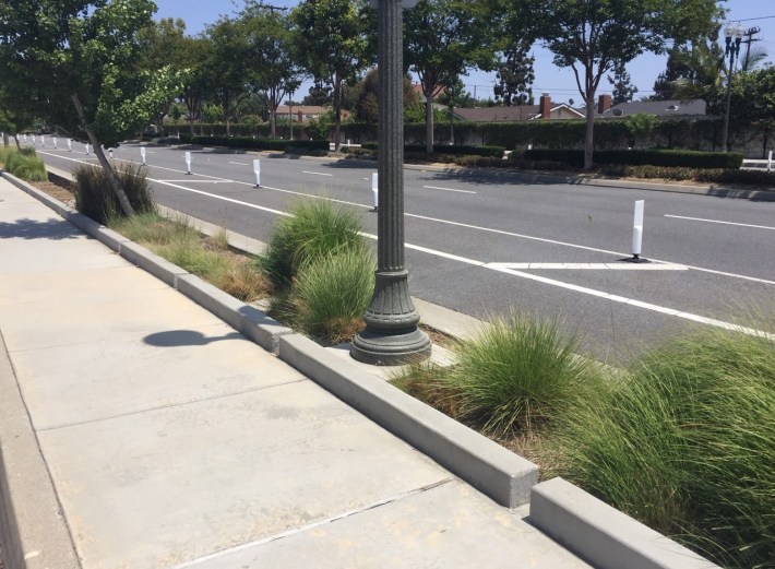 Most Southern California public landscapes are engineered to shunt rainwater off impervious surfaces and into storm drains, waterways, and ultimately into the ocean. The Workman Mill Road infrastructure instead slows down rainwater flow, directing it into landscaped parkways and median areas where it feeds the vegetation and infiltrates into the earth. Slowing water down has multiple benefits: it waters the landscape, cleanses urban runoff, recharges groundwater, and helps to reduce peak storm flows that can result in flooding. (See additional Streetsblog coverage of similar multi-benefit watershed management projects in East L.A. and Panorama City.)