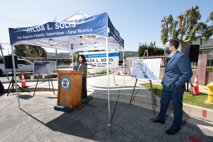 The protected bikeway opened in April 2021. These are the first protected bike lanes on streets in unincorporated L.A. County. The facility arose from a 2019 Solis motion that directed LACDPW to study converting the county’s conventional bike lanes to protected bike lanes where feasible.