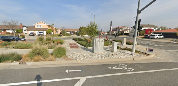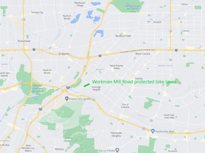 It appears that along Workman Mill Road there are additional asphalt median spaces that could be converted to more rain gardens. There also appears to be sufficient width to connect the protected bike lanes to the nearby San Jose Creek bike/walk path which the county is planning to extend to connect with the San Gabriel River path.