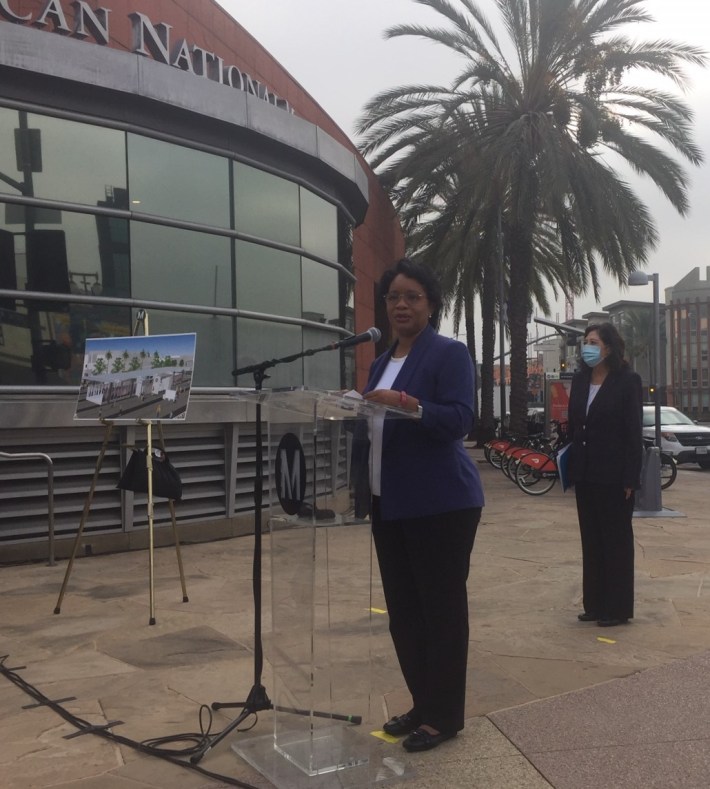 Metro Board Chair Hilda Solis emphasized that the Eastside Access and Regional Connector projects will serve the surrounding community, where, she stated, more than half of households are below the poverty line, and more than half of residents do not own a car.