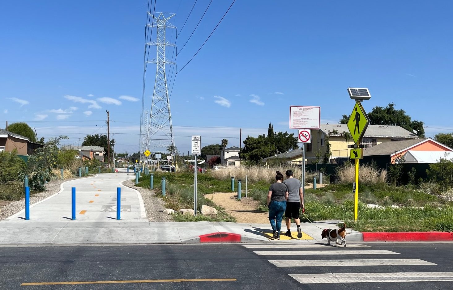 Last year, the southeast L.A. County city of Huntington Park opened Veterans Park, a new linear park featuring walk and bike paths. The half-mile long park is located below high-voltage powerlines and presents a very good example of how to convert underutilized utility corridors into multi-purpose community spaces.