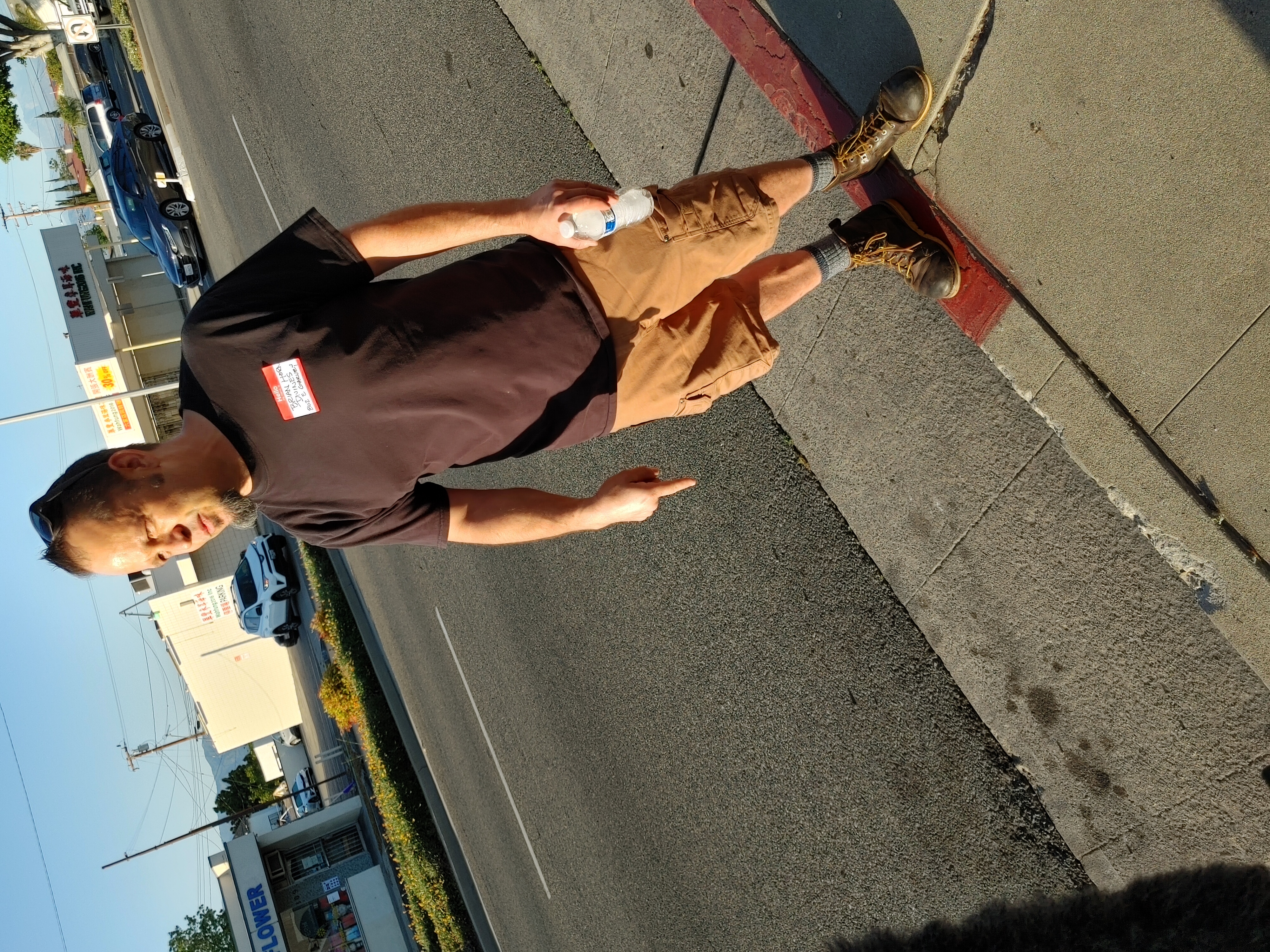 “I’ll show you guys a fun story,” Horn said, motioning over to the curb in front of the store. “See this cracked sidewalk right here? A parked car here saved my life because somebody came down the street, lost control, and hit a parked car here so hard that the parked car ended up on the sidewalk here.” Horn pointed closer at the damage. “And that’s the sidewalk getting broken from the wheel breaking the sidewalk. And if that car wasn’t parked here, my jolly self that was standing over here might not be talking to you today.”