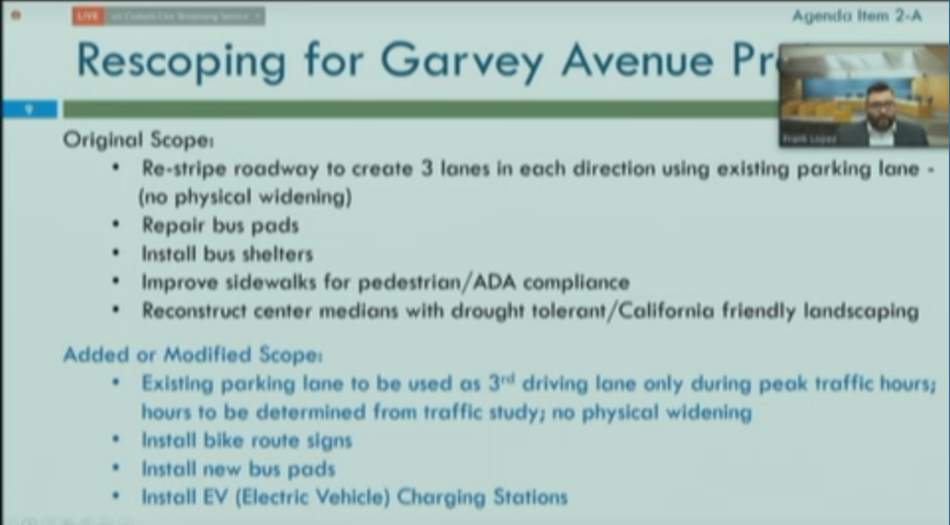 The plan has been tabled at City Hall twice since March 2021. Last time it came up in February 2022, the plan was presented by the city’s Director of Public Works Frank Lopez with the scope adjustment that parking lanes would only be used for driving during “peak traffic hours,” but that still got plenty of negative public comment. City Council voted unanimously to “contact Los Angeles County Metro to seek alternatives to the lane expansion for the Garvey Avenue Capacity Improvements project.”