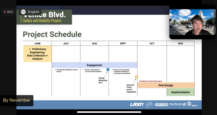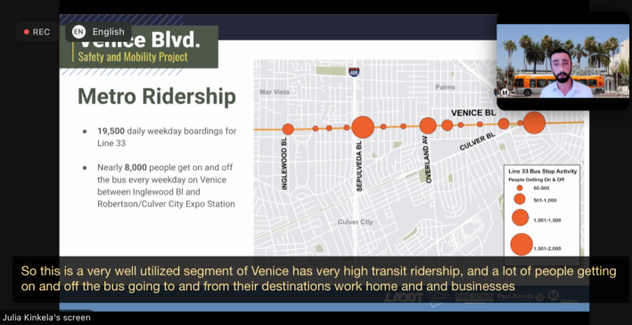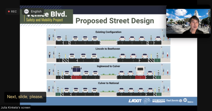 Last night, L.A. City Councilmembers Paul Koretz and Mike Bonin, the L.A. City Department of Transportation (LADOT), and Metro, together hosted a virtual community meeting on bus and bike improvements proposed for Venice Boulevard. According to LADOT, the Zoom meeting was attended by over 300 persons.