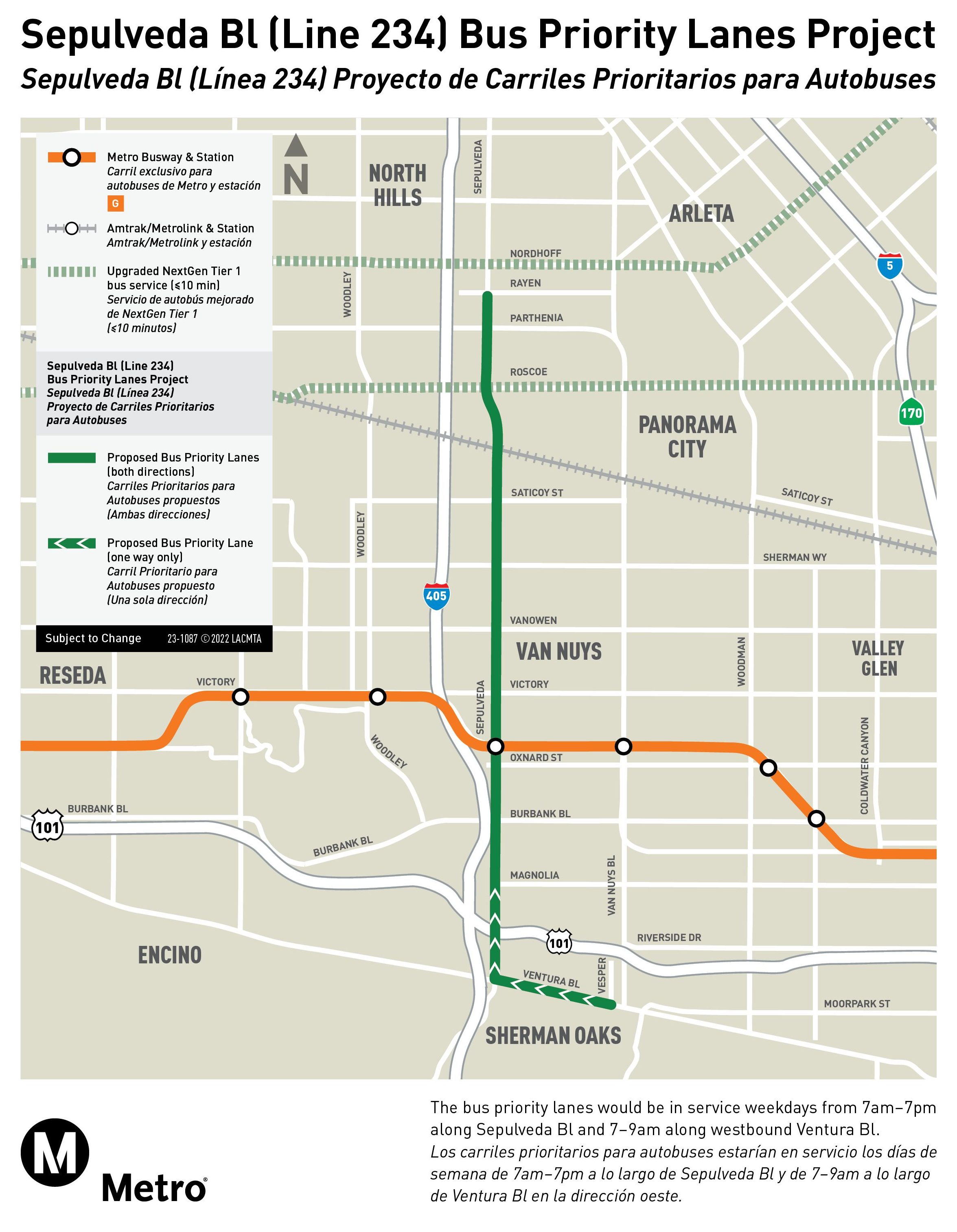 Metro posted a graphic showing planned bus priority lanes on about five miles worth of Sepulveda through the middle of the San Fernando Valley.