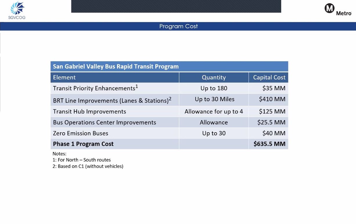 Together, the Valley and Rosemead concepts are estimated to cost between $615 million and $905 million. That’s not counting if multiple east-west routes are built. Ogden said with the $635 million, “We can certainly do maybe some segments east-west, and some segments north-south […] we can definitely afford to develop this type of program in the San Gabriel Valley.” See the chart below of what is estimated to fit within budget.