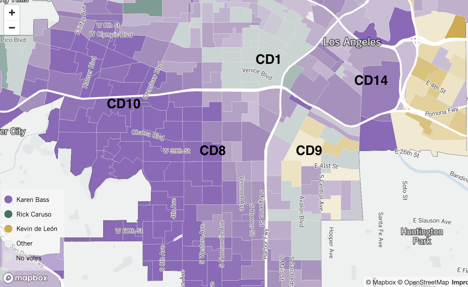 The antagonism ginned up against Bass may also have assisted both de León and billionaire Rick Caruso in winning over some of the most heavily Latino precincts in CD9. Neither made real inroads in CD8, or even west of Main in South L.A. And de León’s candidacy did not resonate in other districts with significant Latino populations (i.e. CD1), including parts of his own.