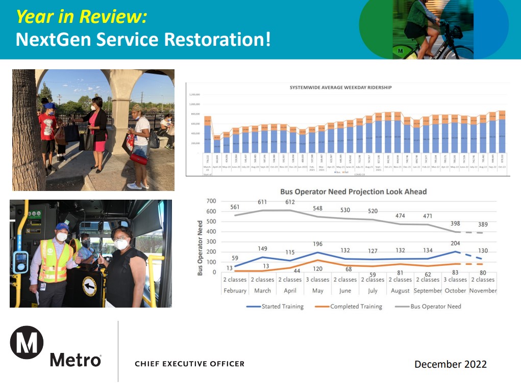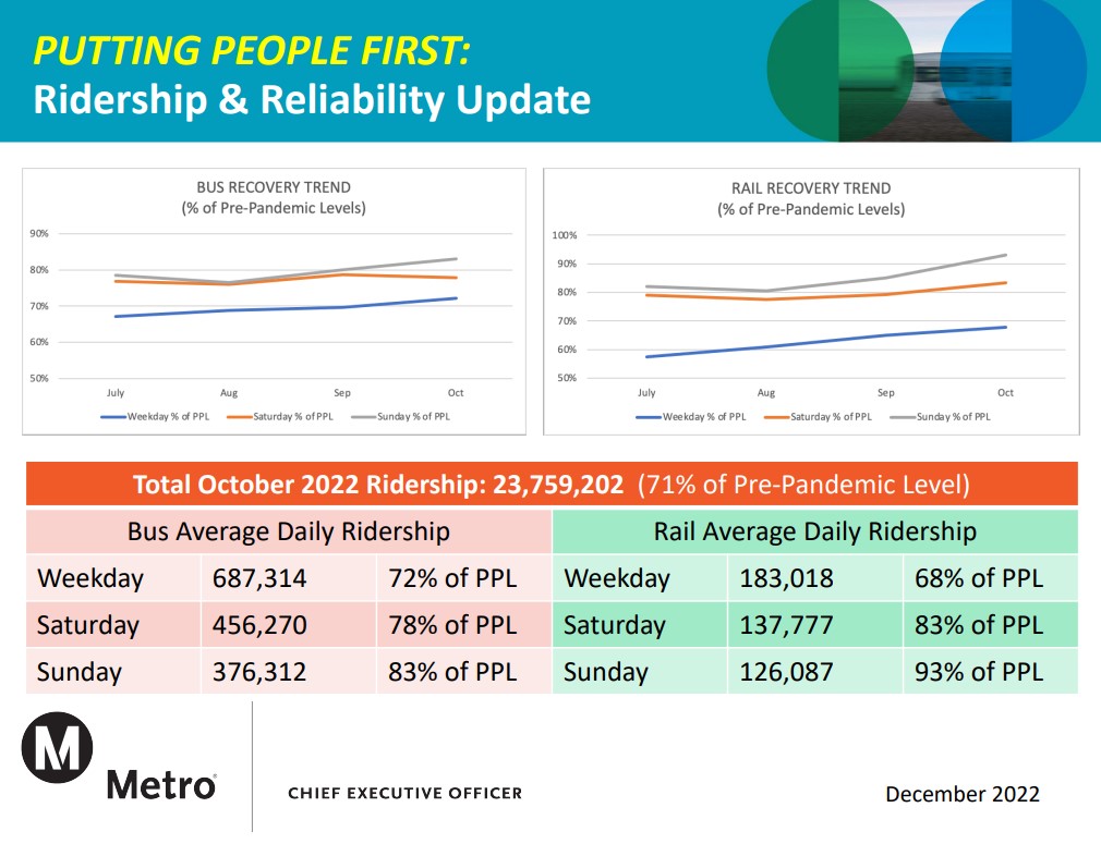 It took a couple weeks for Metro to share CEO Stephanie Wiggins’ December 1 board meeting presentation slides, which show how Metro ridership has been trending positively.