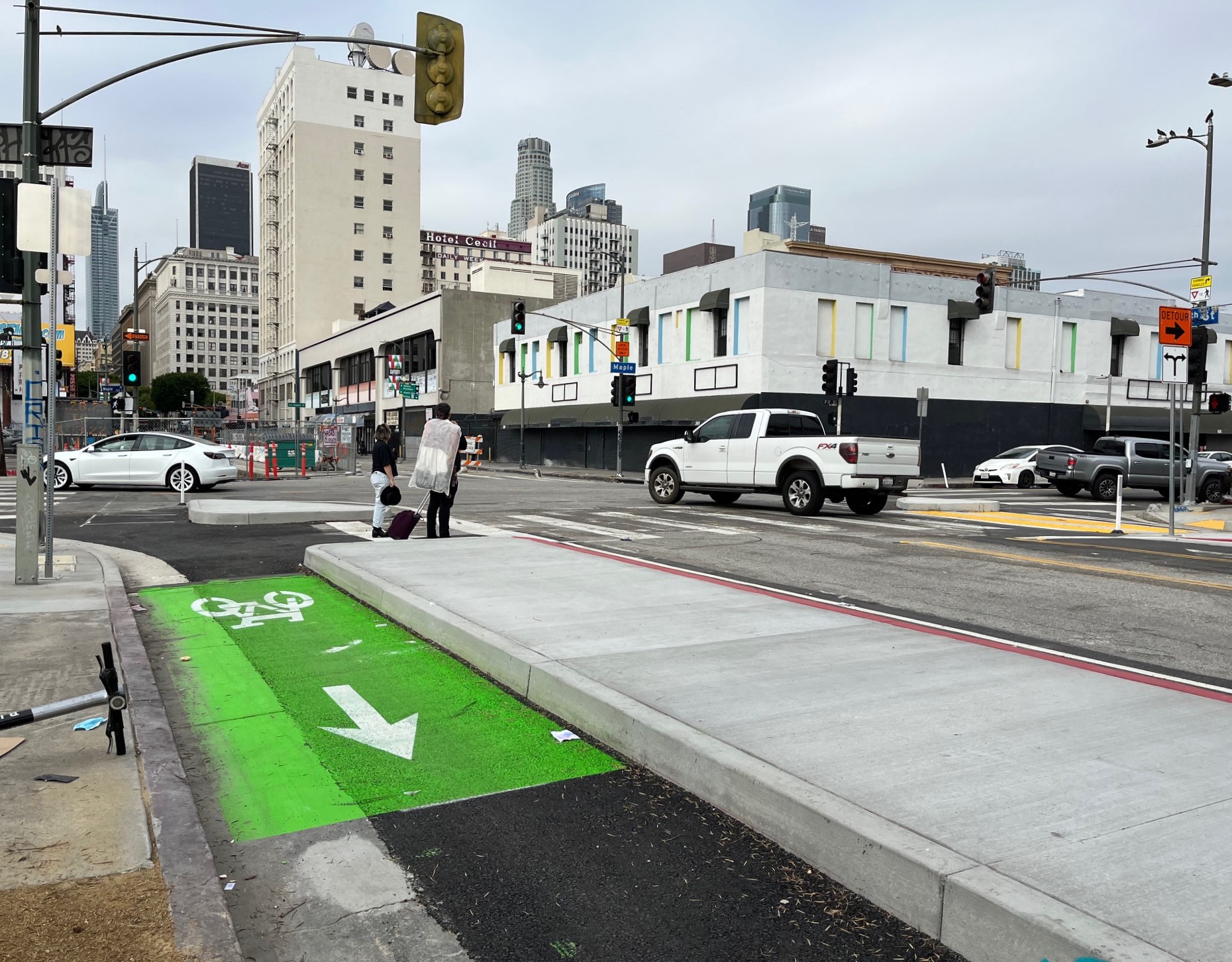 Construction got underway last year on the downtown L.A. Seventh Street Streetscape project, featuring the first L.A. City curb-protected bike lanes, including the city’s first curb-protected intersections. The mile-long project will extend from San Pedro Street to Figueroa Street. Improvements include protected bike lanes, pedestrian/cyclist-scale lighting, bus islands, and new trees.