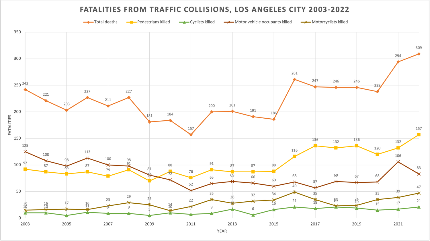 …vulnerable road users – pedestrians and cyclists – are impacted the most by traffic violence in Los Angeles. Pedestrian fatalities were up by 19 percent (157 lives lost, also the highest in 20 years). Bicycle fatalities also increased by 24 percent (21 lives lost).