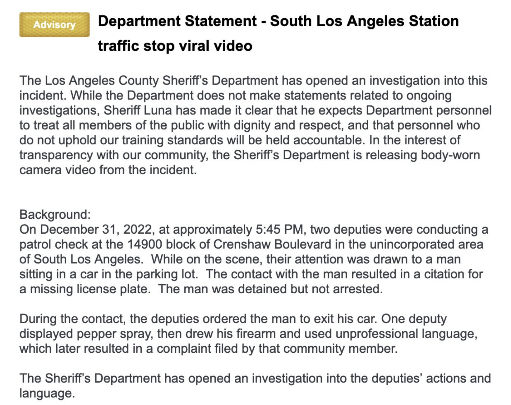 It was the Sheriff’s Department that took a minute to catch up. They did not issue their first public acknowledgement of the stop until January 6. And when they did, it was deeply underwhelming.