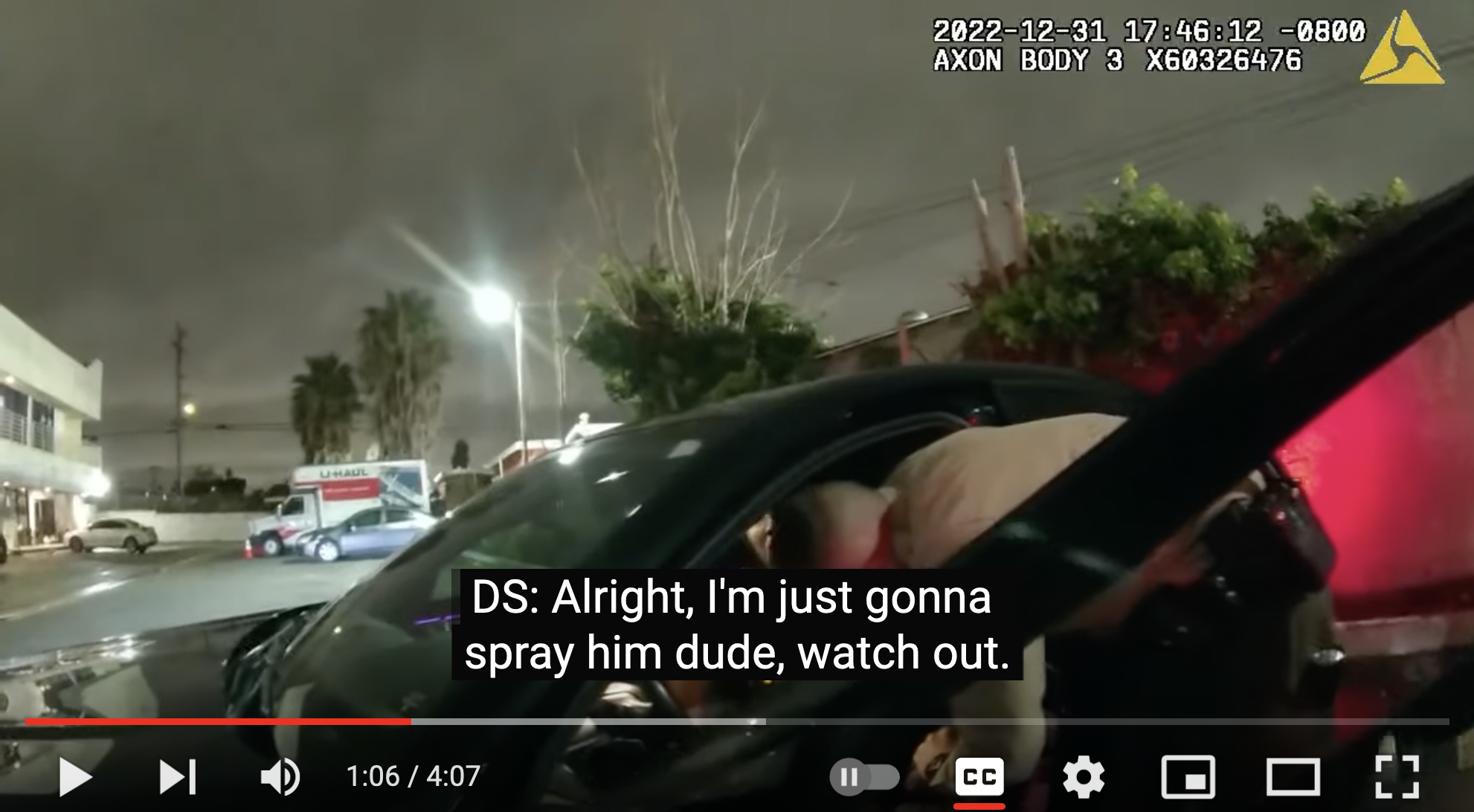 His decision to immediately whip out his pepper spray (when he finally moves to help Ruiz extract Feezy from his car), for example, appears to be born out of impatience and a desire to exert his authority. It is not, as the footage makes abundantly clear, “to protect himself or other persons from assault, to overcome resistance to effect an arrest, or to restrain a violent person in custody,” as LASD’s use-of-force policy would require.