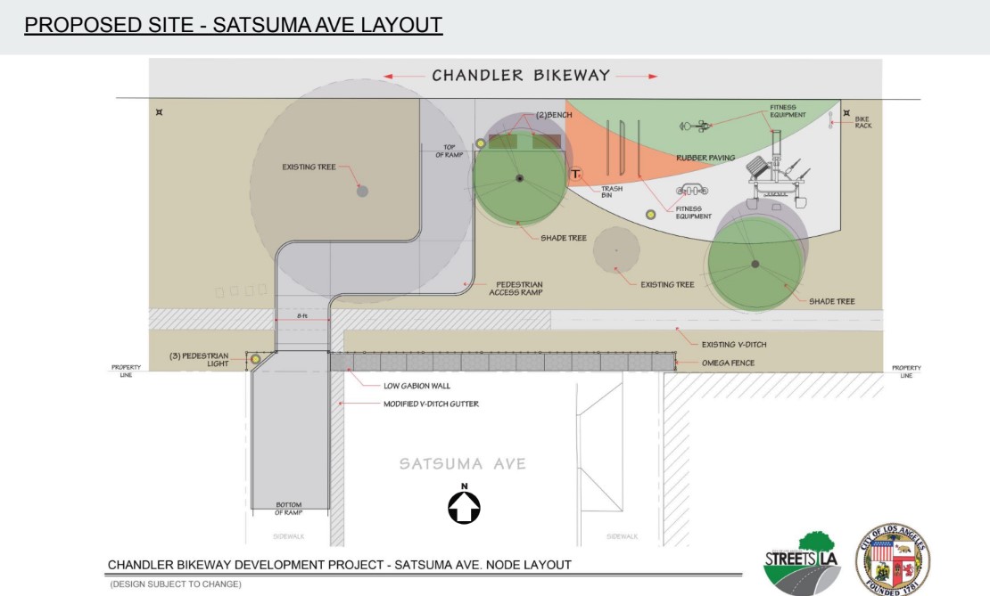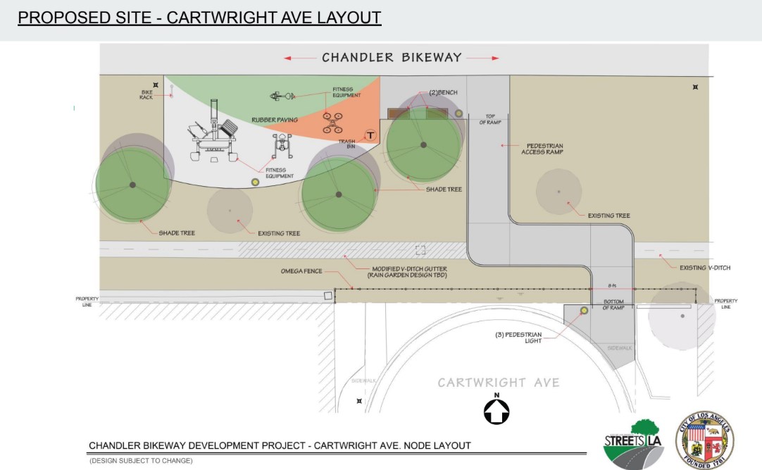 The overall budget for both mini-park access points totals $1.2 million. These Chandler bikeway improvements are not monumental, but represent a worthwhile needed step, especially towards walkability and wheelchair access. This L.A. City portion of the popular Chandler path has long been open to the adjacent streets immediately south, but that access meant going down a small unpaved slope, and through a narrow gate. It has been accessible for people on foot and bike, though impossible for most wheelchair users, and somewhat difficult even for a parent with a child in tow in a stroller or a bike trailer.