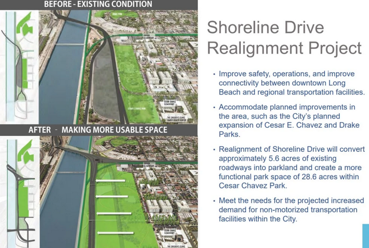That project will reconfigure West Shoreline Drive, converting it to a landscaped local roadway. Lanes will be consolidated, local Cesar Chavez Park will be doubled in size, and traffic will be moved further away from two nearby elementary schools. The changes will help create better, safer access between nearby neighborhoods and community park space, Downtown Long Beach, and other destinations.