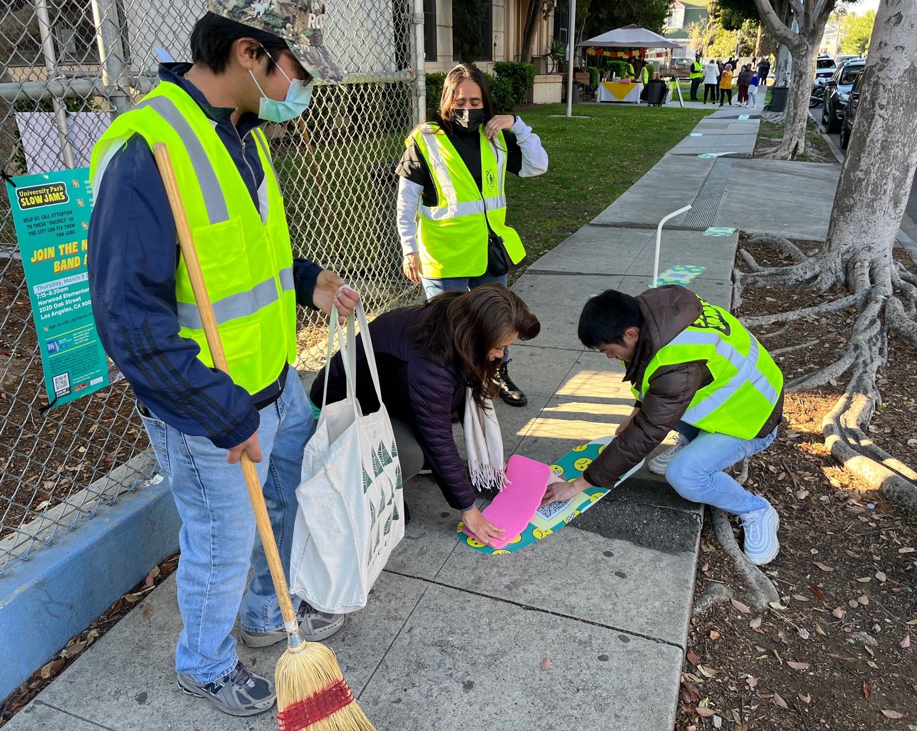 Yesterday morning, advocates placed bright turquoise oversized band-aid stickers on uneven cracked sidewalks in front of Norwood Street Elementary School, just off Washington Boulevard in South Los Angeles. The action was organized by University Park Slow Jams – a collaboration of Public Matters, L.A. Walks, USC Kid Watch, and the USC Sol Price School of Public Policy.
