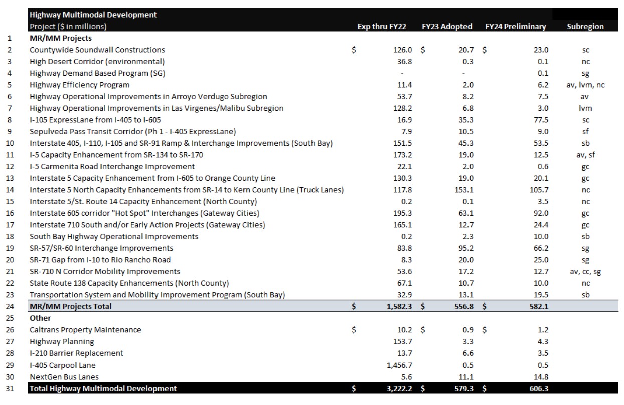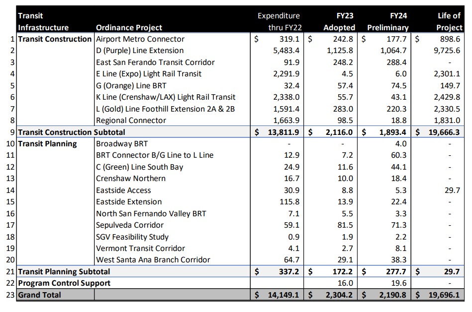 - The Transit Infrastructure budget is not the whole transit budget. It does not include operations, bus and rail fleets, maintenance, etc. Last year there was about $500 million in Transit Improvements (station upgrades, bus electrification, etc.) that were outside of the mega-projects transit capital budget above. Metro staff do not appear to have shared the proposed FY23-24 Transit Improvements budget yet.