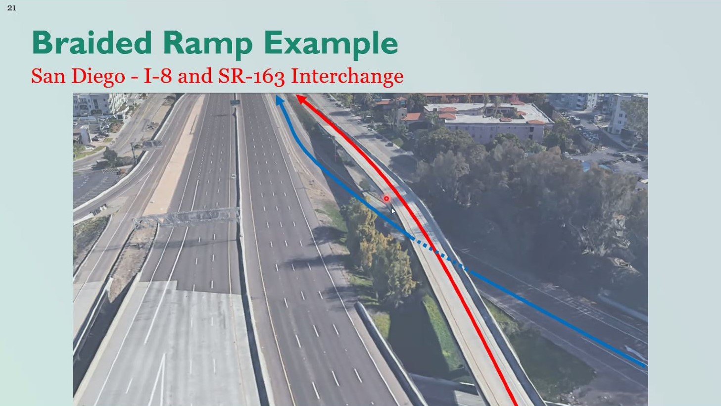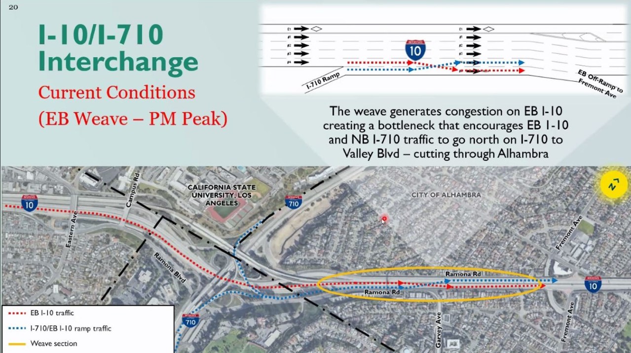 “To help this condition, what we’re proposing to do is to vertically separate that merge or weave condition by elevating [it].” said Justin Gatza, Project Manager for Kimley-Horn. “What the red line [in the diagram] represents [is] the eastbound I-10 off-ramp, and we’re gonna break that or fly it over [with a short bridge] the blue line which is the 710 [on-]ramp that will come underneath it. So in essence, the freeway ramps will be doing the weaving and not necessarily the cars in this case.”
