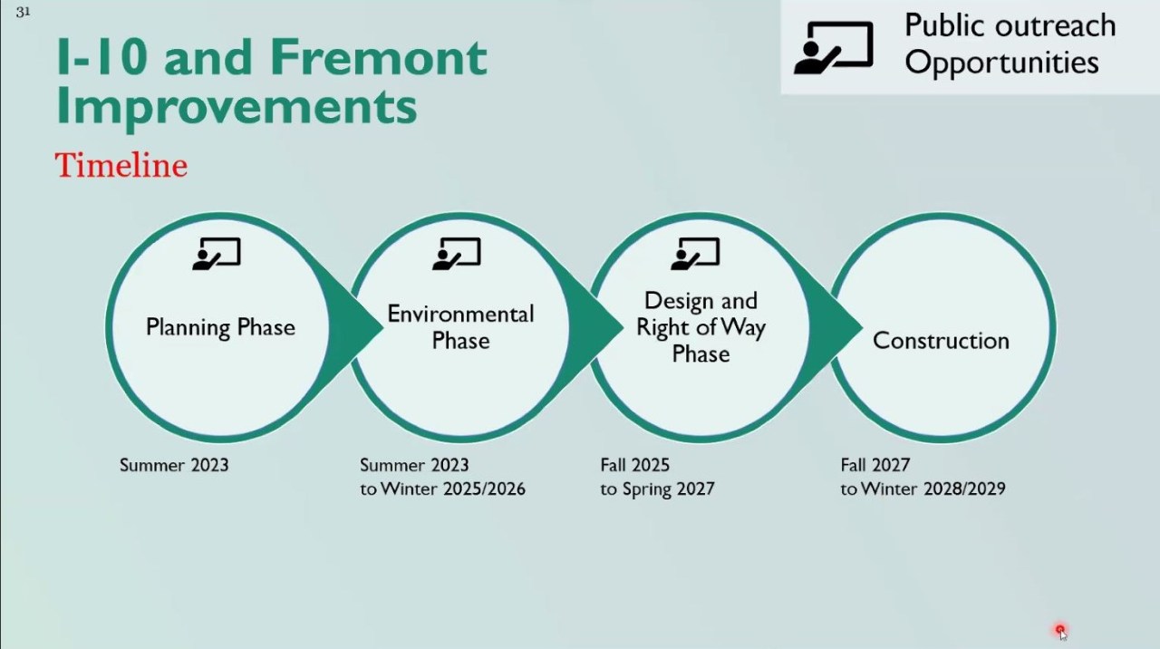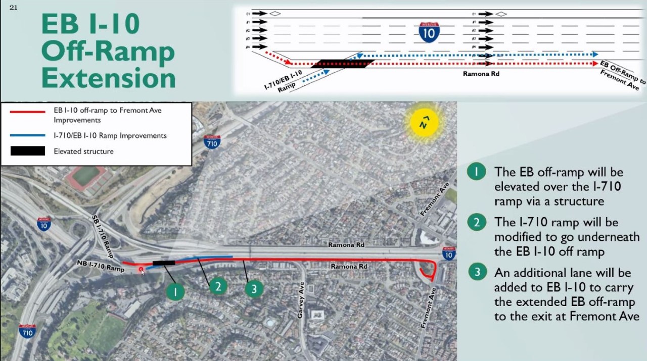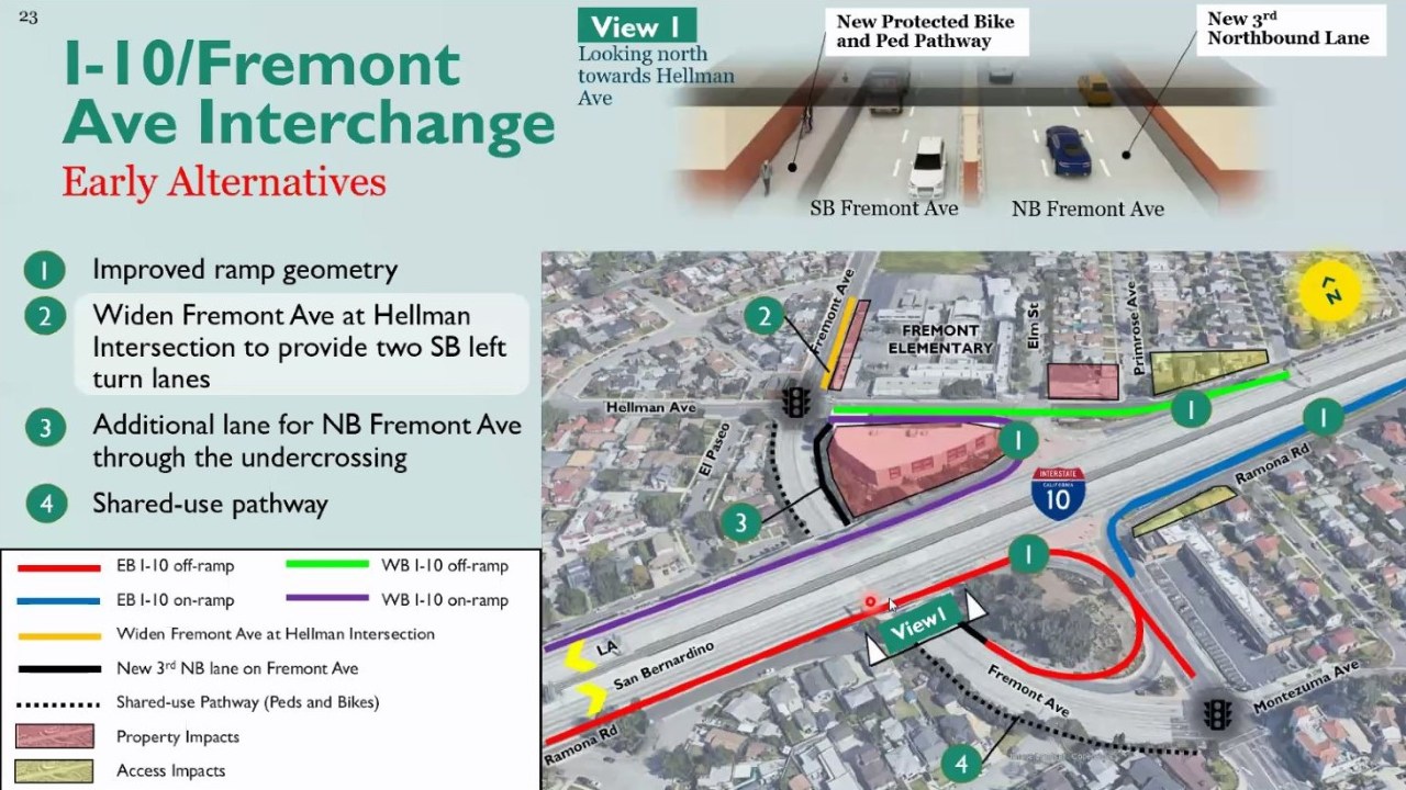 For a brief stretch of the eastbound 10, one more lane would be added to help drivers to merge. But that’s not the only adjustment they had in mind for Fremont. “The interchange is very old, you have these really antiquated ramps that are really short and low speed.” Gatza said. “And then you also have these stop controlled intersections that exist at Elm Street and Hellman Avenue, as well as Ramona Road and Fremont Avenue, that when you add that to the short ramps, you get a lot of that traffic really spilling back out into I-10.”
