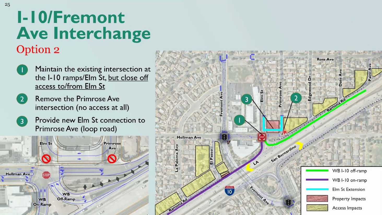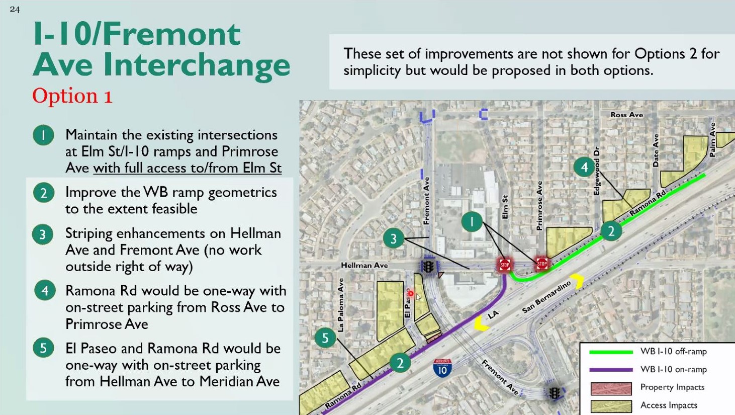 Both options would “improve westbound ramp geometry,” add “striping enhancements” on Hellman and Fremont, and would turn El Paseo and Ramona Road into one-way streets (just on the north side of the freeway).
