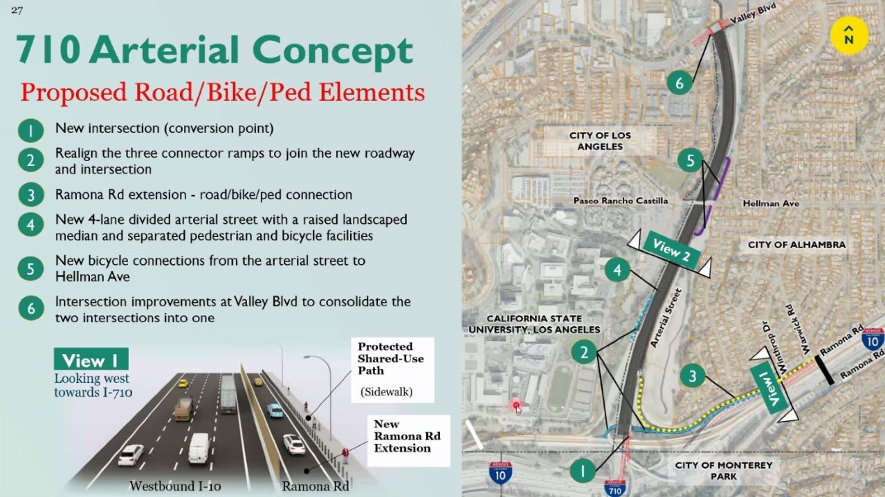 Gatza suggested that this starts with a signalized intersection where the 710 would end at the 10. In this concept, Ramona Road would be extended to meet up with the new arterial; along the north side of Ramona would be a shared use protected bike/walk path. That would connect to side-by-side pedestrian and bike facilities on the arterial, which would connect to Hellman and Cal State L.A. up above the arterial.