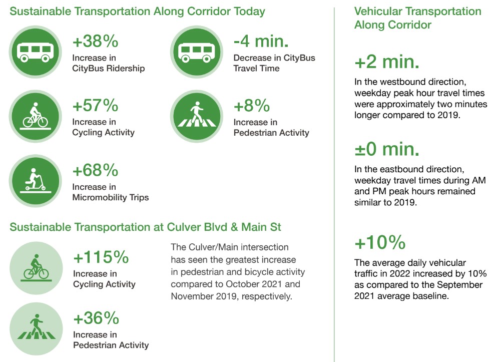 Similar to the mid-pilot evaluation last November, the city’s latest third-party evaluation of MoveCC is positively glowing. The city’s post-pilot report shows that bicycling, walking, and transit ridership are up, as is sales tax revenue. Specifically, Culver City found: (all bullets from MoveCC report)