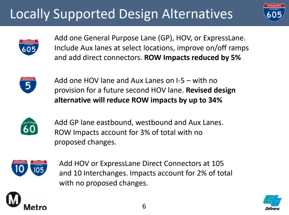 In early 2021, as the agencies began developing less harmful 605CIP alternatives, Metro presented some concepts for reducing the project’s right-of-way impacts. At that time, there were “no proposed changes” to impacts along the 60 Freeway (where Linard and Famosa homes are) as parcels impacted there only accounted for three percent of overall acquisitions.