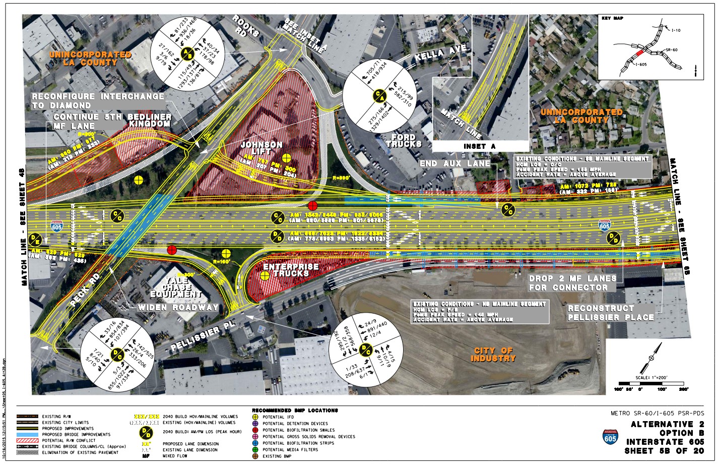 In addition to those demolitions at the south end of the 605CIP, the Metro/Caltrans 2015 PSR-PDS shows proposed demolitions toward the north end of the project. The north part of the 605CIP would widen the 605 Freeway from Beverly Boulevard (in Pico Rivera and Whittier) to the 10 Freeway interchange (in Baldwin Park), and also widen the 60 Freeway from Santa Anita Avenue (in South El Monte) to just east of Turnbull Canyon Road (in Hacienda Heights).