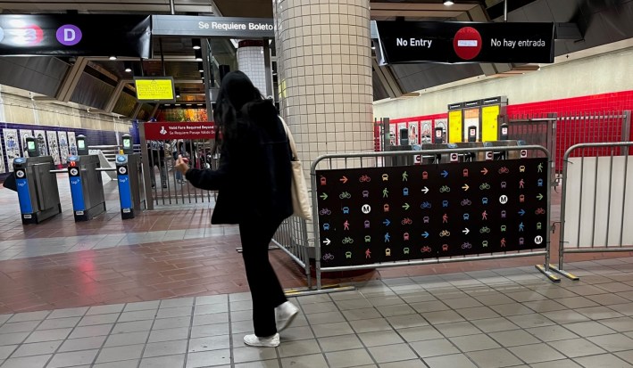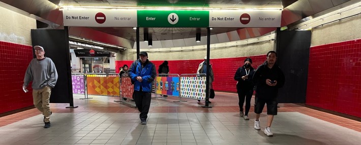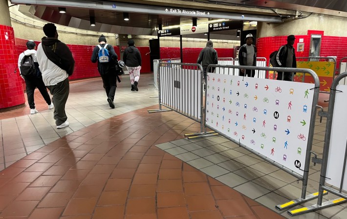 Metro recently installed new temporary metal barriers channel riders into three separate streams: one entering toward the platform, two exiting toward the street.