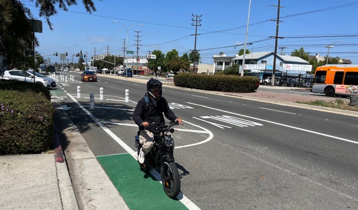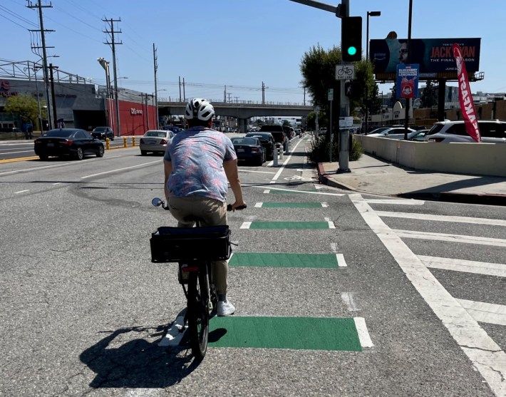 Since SBLA last reported on Venice’s then-half-done protected lanes back in March, the city has added green striping in conflict zones.