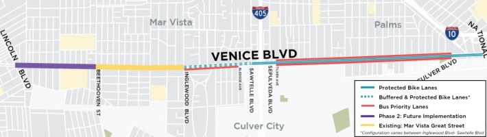 Yesterday, Los Angeles City and Metro celebrated the official opening of bus and bike upgrades on Venice Boulevard through West Los Angeles. The city Transportation Department’s (LADOT) Venice Boulevard Safety and Mobility Project added 2.1 miles of new 24/7 bus-only lanes between Inglewood Boulevard and Culver Boulevard.