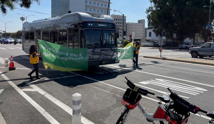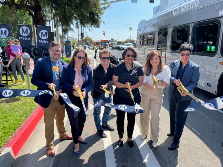 Metro CEO Stephanie Wiggins praised bus lane improvements as centering customers in everything Metro does. LADOT Interim General Manager Connie Llanos upheld the “momentous” project as an example of what LADOT and Metro can partner together to do throughout Los Angeles. Indeed, Metro and LADOT have already collaborated on seven new bus-only lane stretches in the past couple years, with additional bus lanes on the way: La Brea Avenue, Sepulveda Boulevard, Florence Avenue, and Roscoe Boulevard.
