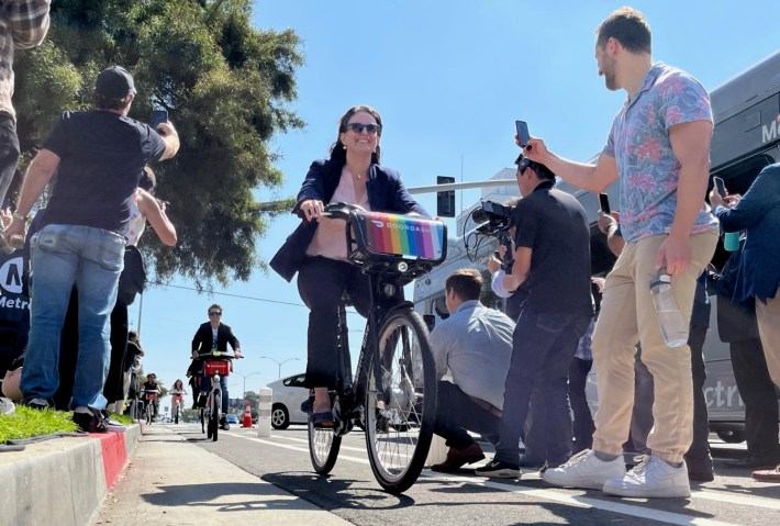 After speeches, Yaroslavsky, Wiggins, Llanos, Kaiser, and Schneider cut a ceremonial ribbon to open the bike lane, then they all hopped on Metro Bike Share bikes for an inaugural ride.