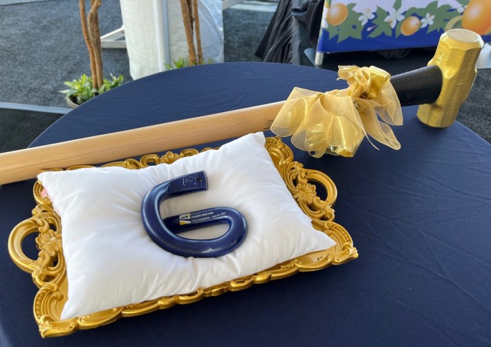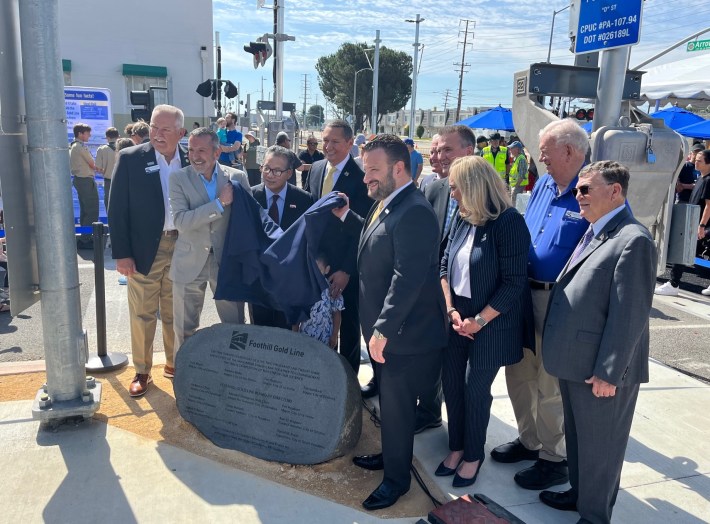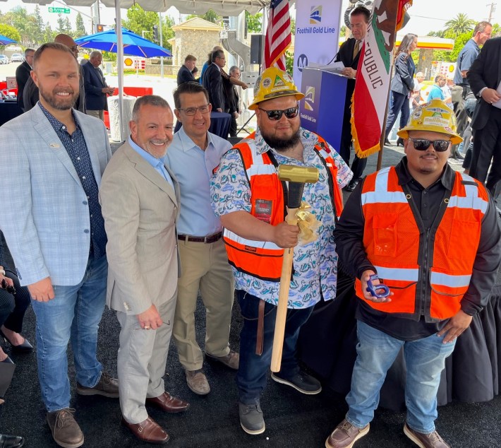 Last Saturday, the Foothill Gold Line Construction Authority hosted a ceremony to mark the completion of track work. The Authority is tasked by Metro to build the Foothill Gold Line, now renamed the A Line. The Authority is currently building the $1.6 billion 9.1-mile extension of the light rail line through the San Gabriel Valley cities of Glendora, San Dimas, La Verne, and Pomona.