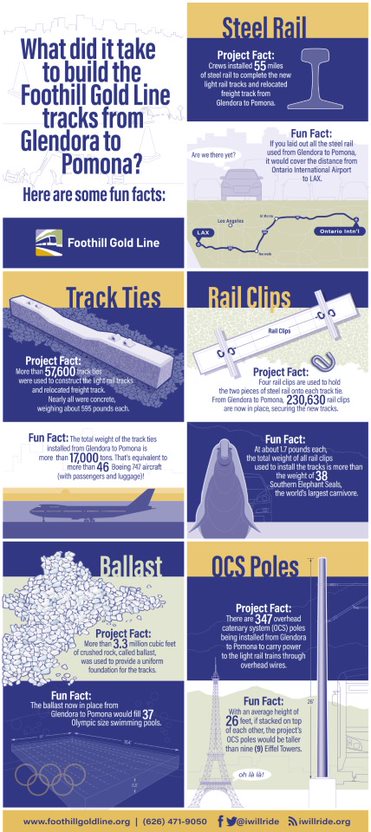 Glendora to Pomona construction is over 71 percent completed. The authority expects finish construction by January 2025, at which point the line would be turned over to Metro for testing, with a public opening in mid to late 2025.