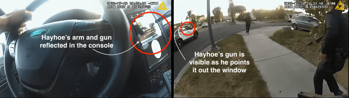 Hayhoe’s own body cam, in contrast, shows he had drawn and pointed it out the window well before then.
