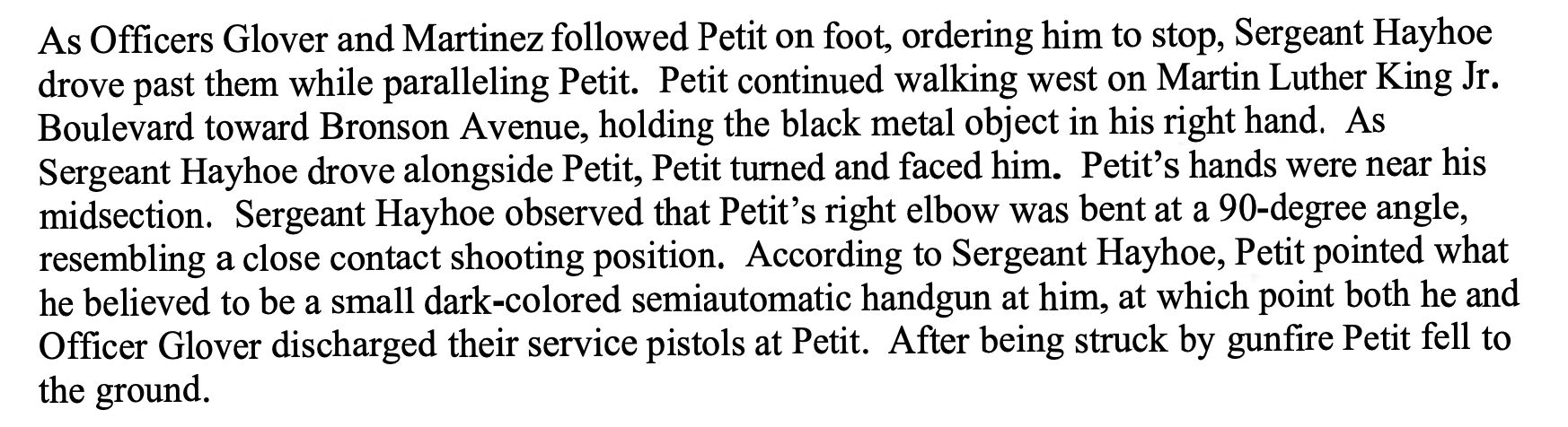 Despite having been the first officer to make contact with Petit and the one to have realized the object in Petit’s hand was not a firearm, Martinez’ account of events is barely referenced throughout the 22-page report.