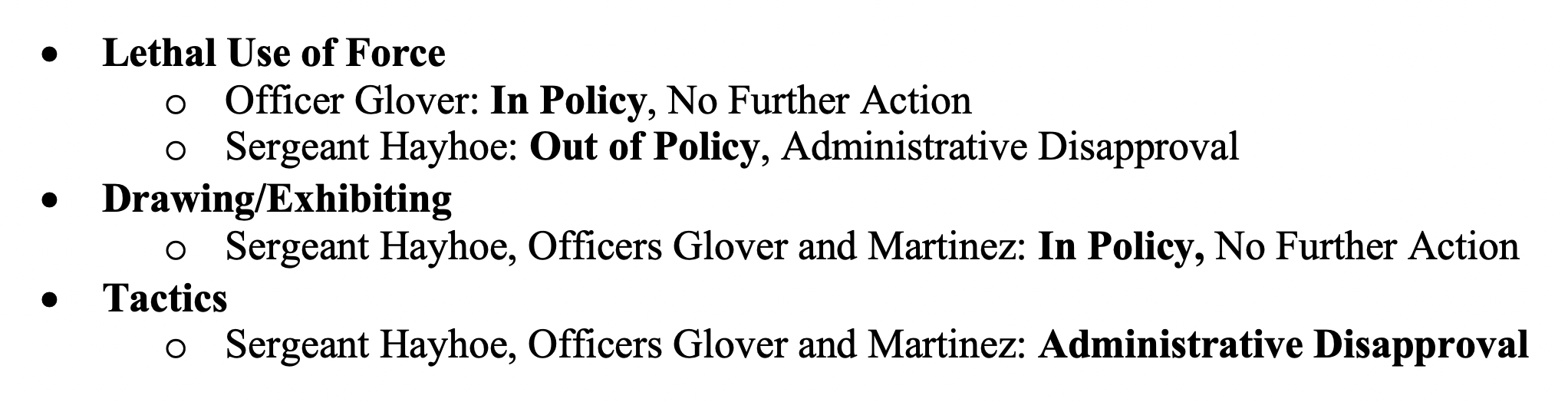 The only notable exception is the critique of Hayhoe’s performance as a supervisor during a critical incident – both his having inserted himself into the effort to detain Petit (instead of slowing down the approach and formulating a plan with his subordinates) and his failure to properly manage the scene after the shooting (e.g. declare himself incident commander, separate Glover out and admonish him against speaking to others about the incident, etc.).