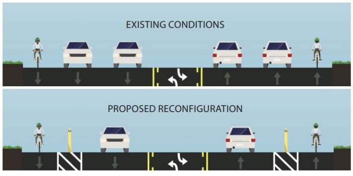 The current LADOT Forest Lawn proposal is a good inexpensive step in the right direction, although a more ideal facility would probably be a two-way protected bikeway on one side of the street, with actual substantial (more expensive) protection (such as concrete barriers, curbs, or metal bollards) between cyclists and cars.