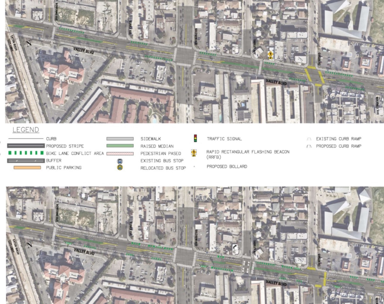 Throughout the Valley Boulevard corridor, American Disability Act improvements are planned, like at the intersection of Garvey, where some curb ramps are missing.