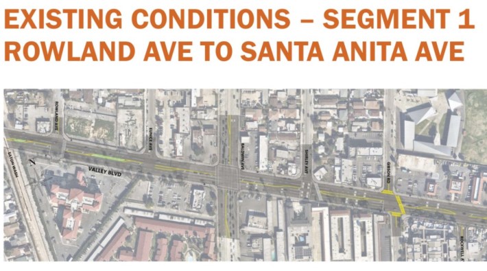 The city of El Monte is in the initial stages of planning a large-scale complete streets project on Valley Boulevard and Main Street. The city’s feasibility study is currently in the conceptual design phase, with proposed designs shared at recent meetings and pop-ups. Two options have been presented so far (see the current proposal details via the city’s slide show, much of which is too wide to take legible screen captures), though these early designs are already changing in response to community feedback.