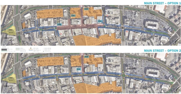 Initial concepts would close that one block of Main, discouraging eastbound drivers from driving into the proposed pedestrianized stretch of Main Street.