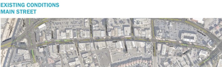 Main Street currently has on-street diagonal parking in front of stores, and many larger parking lots behind them.