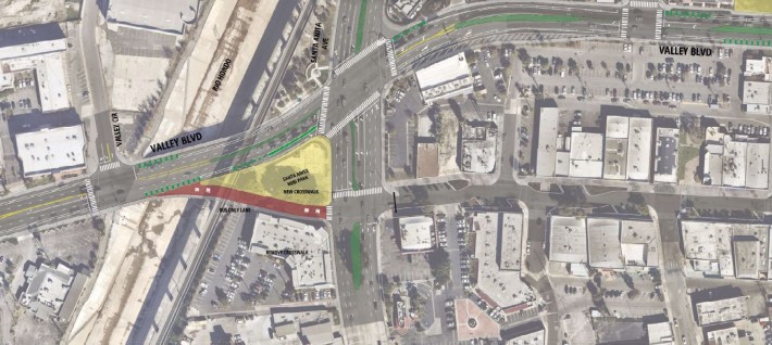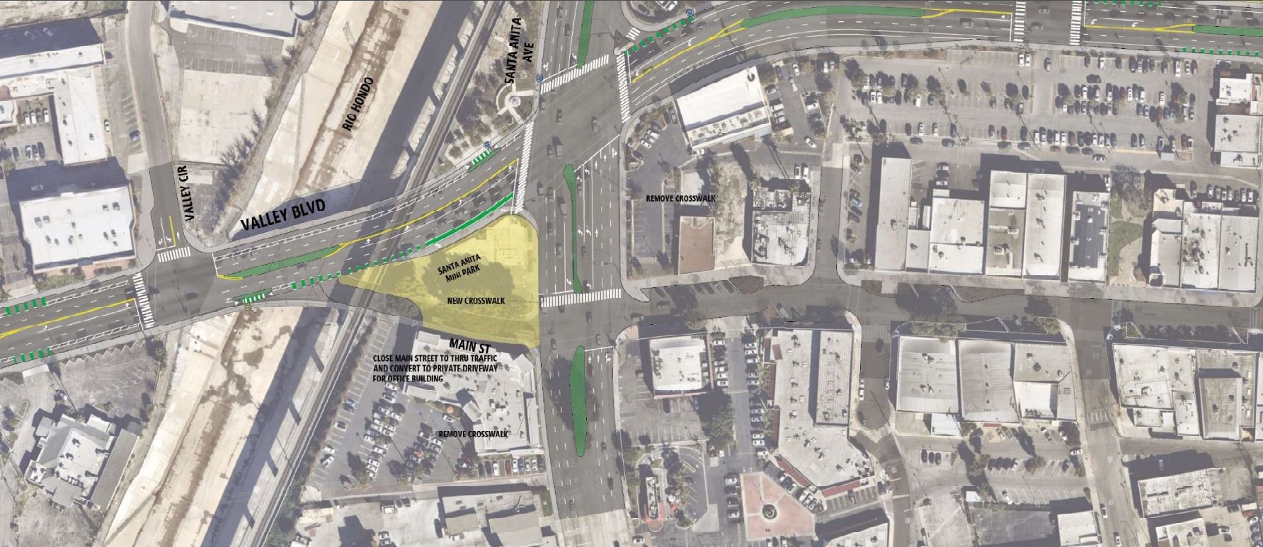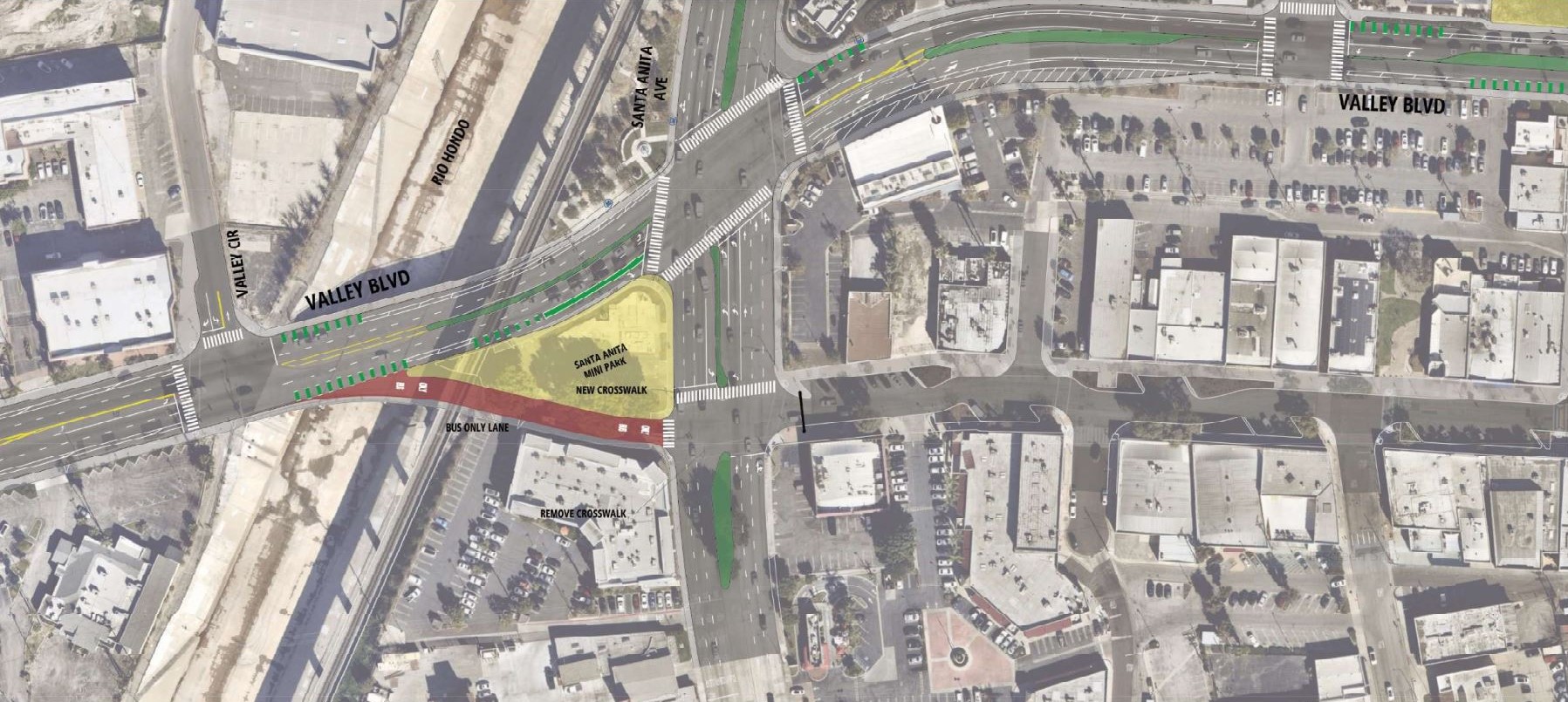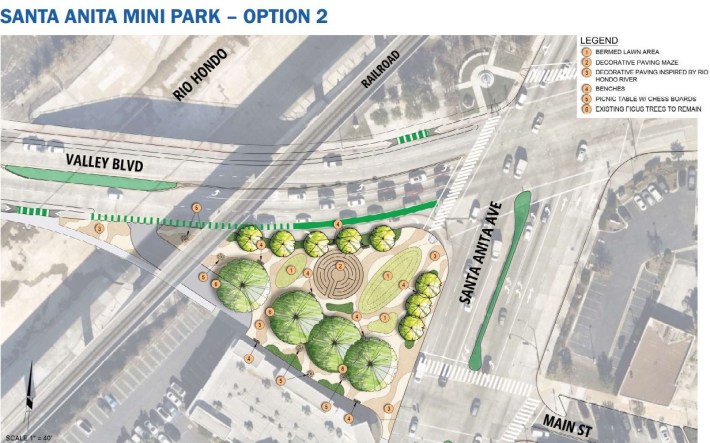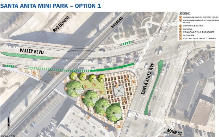 Currently eastbound drivers on Valley can fork to the right to drive straight into the Valley Mall via a one-block one-way stretch of Main Street. The city is proposing a new pocket park there, on the empty lot bounded by Valley, Main, and Santa Anita – adjacent to the Rio Hondo path.