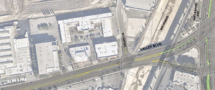The narrower segment of Valley that was created by rerouting in 1965 (between Santa Anita Avenue and Ramona Boulevard) does not have sufficient space to easily accommodate a buffer between cyclists and cars, even with a lane reduction.