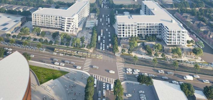 Crenshaw Crossing is the long-planned mixed-used development to be located on L.A. County and Metro land where the Metro E and K Lines intersect, at Crenshaw Boulevard at Exposition Boulevard, in South L.A. The city approved plans for two eight-story buildings containing 401 apartments. In 2021, the project was to be roughly half affordable housing, pending state funds. AHSC funds will cover 176 affordable units.