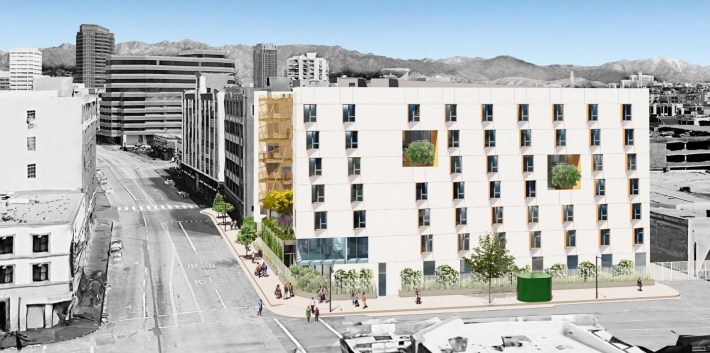 Located at the corner of 5th Street and San Pedro Street in Skid Row, the Downtown Women’s Center campus expansion will construct a new seven-story residential building with 98 housing units for victims of domestic violence and women experiencing homelessness.