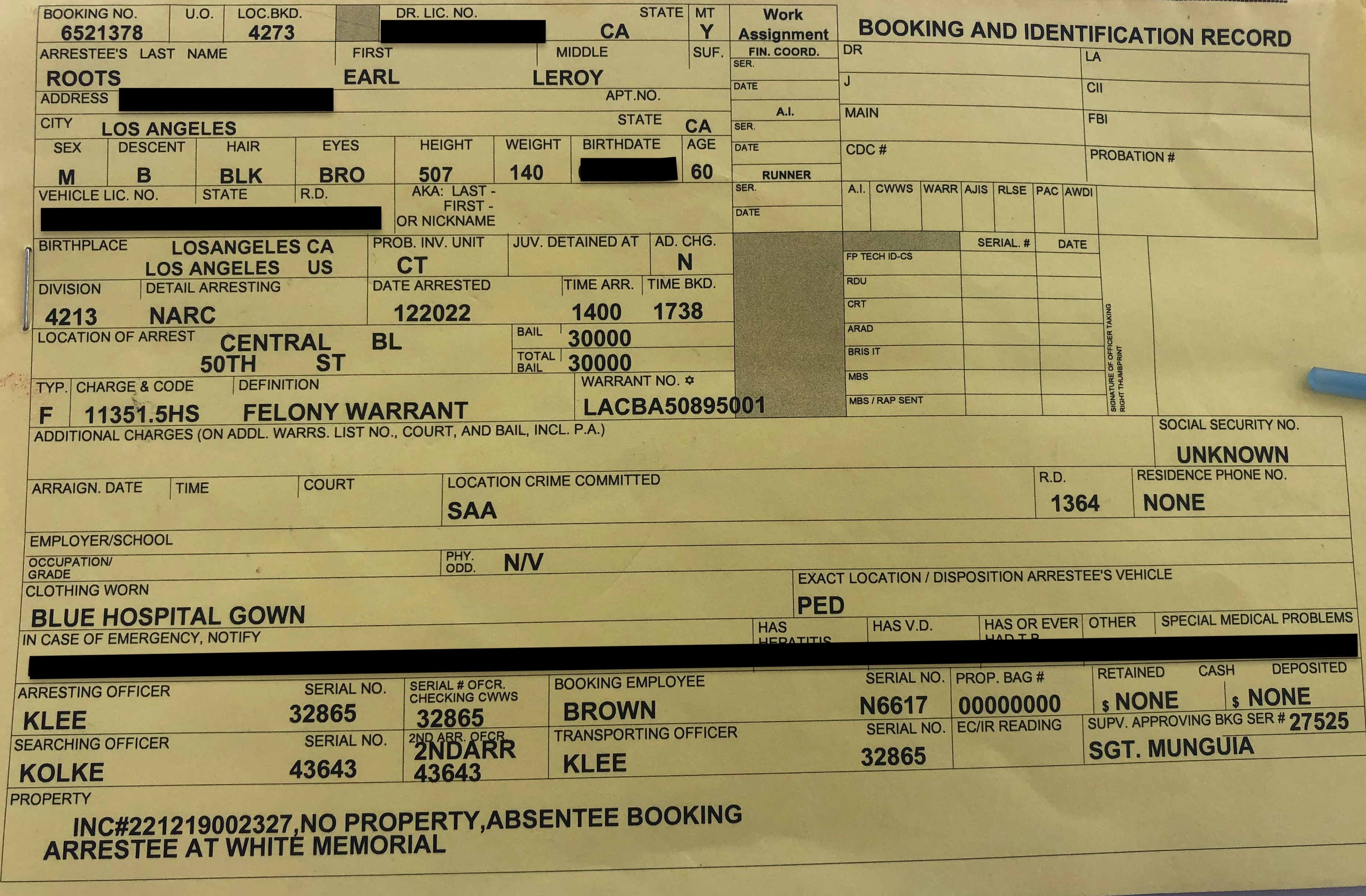 Tapping the December 19 booking notice, he points out that LAPD was continuing to use an address he had not lived at in some time. He says he believes that was how he had missed the court date that triggered the warrant Kolke and Klee were trying to pick him up on: the court information had apparently gone to that old address. Because he had never gotten any notice, he says he had just assumed the case had been dismissed.