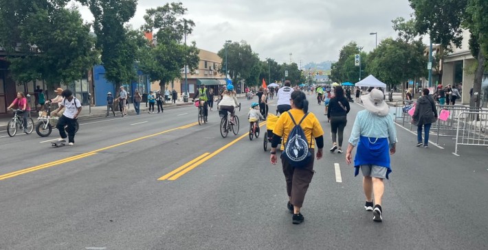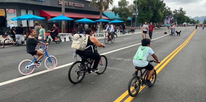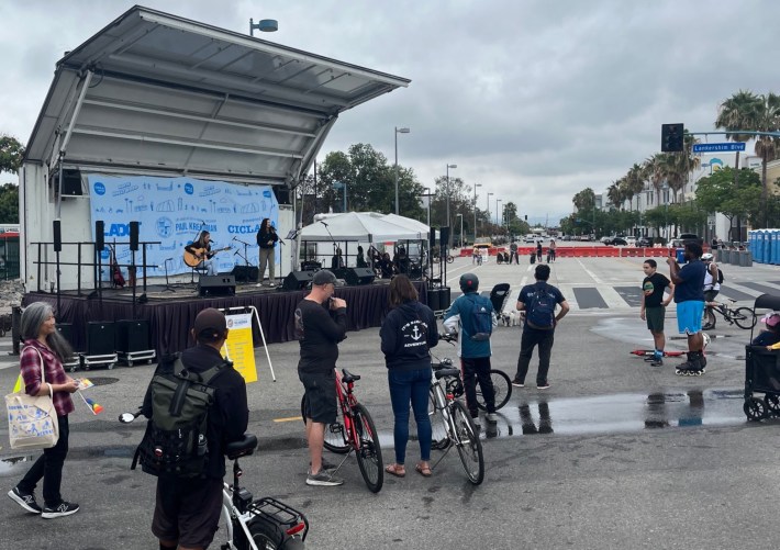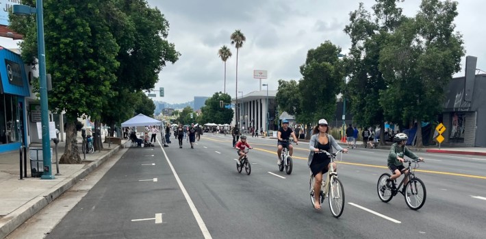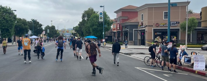 The gray weather that saw light morning rain in parts of L.A. didn’t do much to dampen the large crowds. Thousands of Angelenos crowded North Hollywood streets and businesses. Participants explored on skates, wheelchairs, feet, and bikes. Music peppered the route, with stages at north and south ends. Local businesses spilled into the street with outdoor dining, booths, and tables.