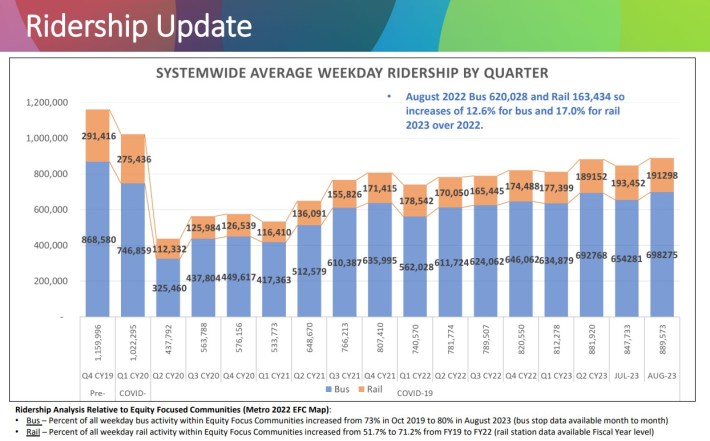 As of August, Metro ridership is at a four-year high, with nearly 900,000 weekday daily boardings. Metro bus ridership has recovered to 80.1 percent of pre-COVID levels. Rail is at 59.5 percent; overall transit is 75.6 percent (see SBLA spreadsheet).