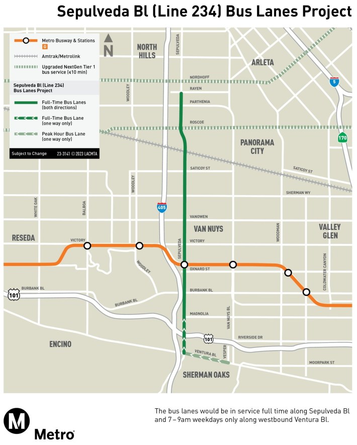 The Sepulveda and Ventura bus lanes primarily speed up service on Metro line 234, which currently carries nearly 9,000 riders each weekday. The Sepulveda lanes also serve parts of Metro lines 154 and 155, plus LADOT’s Panorama City/Van Nuys DASH bus.